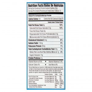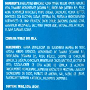 Ingredientes: Harina enriquecida sin blanquear (harina de trigo, niacina, hierro reducido, mononitrato de tiamina {vitamina B1}, riboflavina {vitamina B2}, ácido fólico), chips de chocolate semidulce (azúcar, chocolate, manteca de cacao, dextrosa, lecitina de soja), azúcar, Aceite de soja, aceite de semilla de algodón parcialmente hidrogenado, jarabe de maíz con alto contenido de fructosa, levadura (bicarbonato de sodio, fosfato de amonio), sal, suero de leche (de leche), saborizante natural y artificial, colorante caramelo